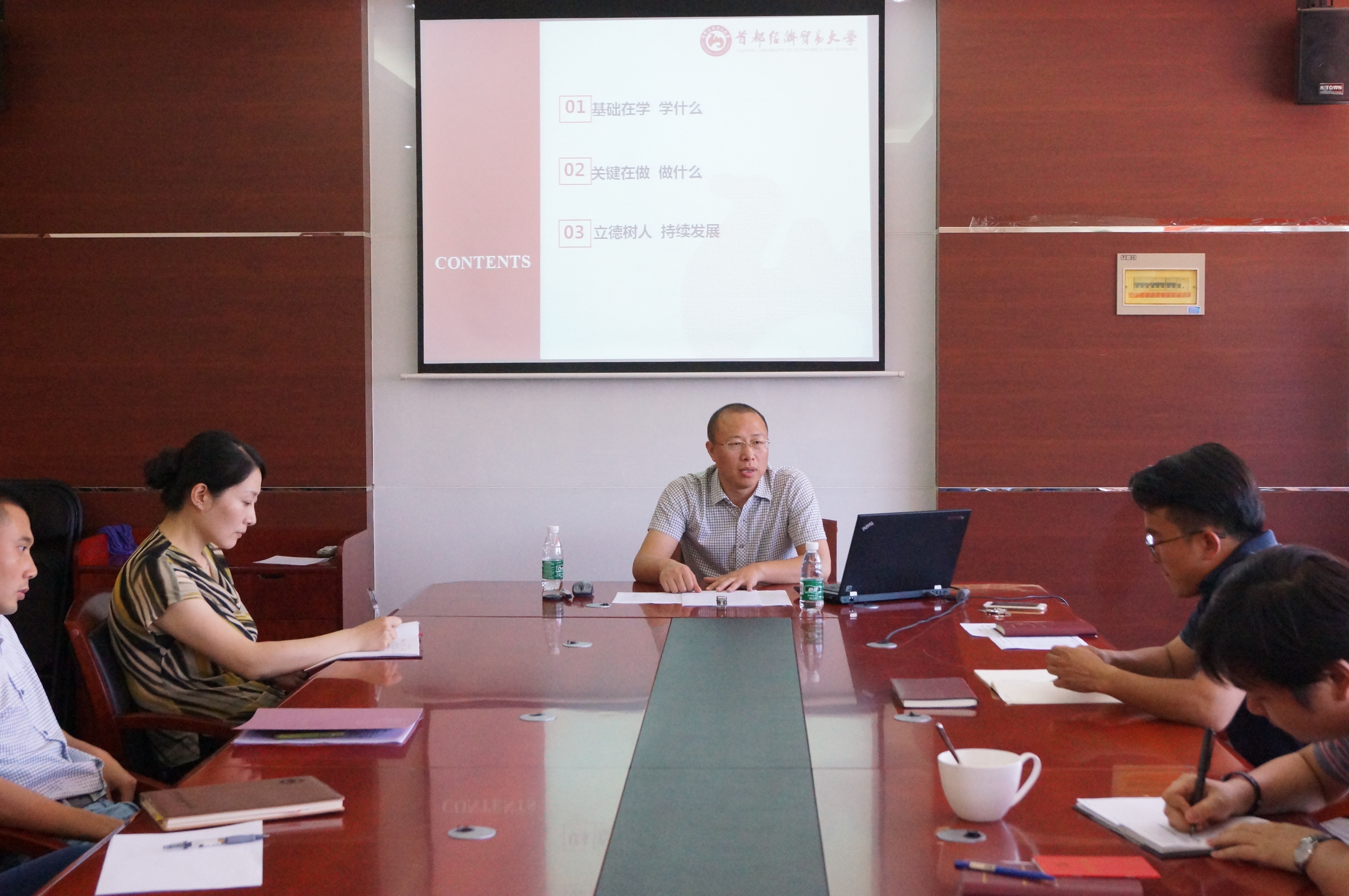 接下来,刘书记介绍了我国“十三五”规划中强调的“创新、协调、绿色、开放、共享”的五大发展理念,这是关系我国发展全局的一场深刻变革。随后,刘书记着重介绍了学校“十三五”规划和发展目标:立足北京、服务社会,把学校建设成为现代化、国际化、多科性、特色鲜明的国内一流、国际知名的财经大学,为融入国家建设“世界一流大学和一流学科”战略奠定基础。具体到我院自身的建设与发展,刘书记在课上总结了我们学院已有成就,并指出我们学院“十三五”期间的发展目标是建设“国内一流”和“国际知名”的经管学院,并指出了学院目前在管理和科研上存在的一系列问题。最后,刘书记再次强调了我们学院“真诚、尊重、合作”的办学建院理念。