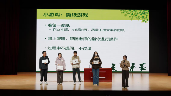 讲座在轻松有趣的“撕纸游戏”中拉开帷幕。这一破冰互动让同学们在亲身参与中感受到个体理解与创造力的多样性,激发了大家主动交流、积极交友的兴趣。