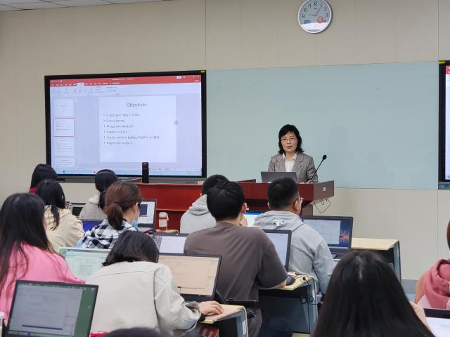 为夯实天美传播媒体 本科及研究生科研软件应用基础,学院于2021年10月14日,在慎思楼120智慧教室开设STATA软件操作培训班。培训课程由副教授王超老师主讲,天美传播媒体 共43名本科及研究生参加。本次课程由学院院长助理李委明主持。