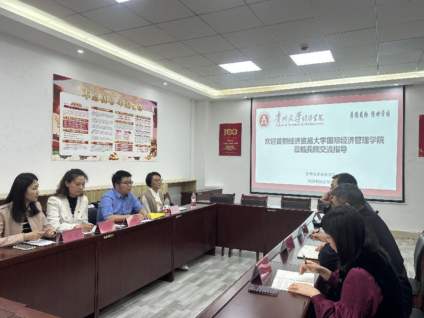 接着,双方教师移步会议室开展座谈交流。李委明就数量经济学研究生的招生政策和培养做了详细阐明,期待经济学院积极学子报考。教学科科长臧绍刚介绍了学院本科生培养及考研情况。双方还就共同关注的人才培养、课程思政建设等问题进行了交流,并围绕今后进一步的教学合作进行了深入探讨。贵州大学经济学院党委书记胡环宇、财政与金融系系主任熊德斌、经济与贸易系系主任石虹、教学科科长臧绍刚参加座谈。通过本次座谈交流,双方均表示未来拟加强两院在教学科研、人才培养、就业实践等方面的合作,共筑发展桥梁。